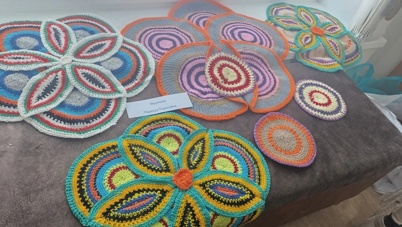 Надежда Федотова из Воскресенского приехала с вязанными крючком ковриками причудливых конфигураций: