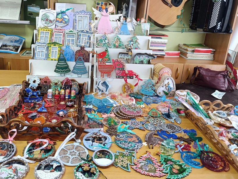 Из несъедобного, но красивого предлагались разнообразные сувениры, игрушки, полезные для хозяек поделки, украшения из натурального камня и других природных материалов, обновы для гардероба. У библиотекаря из Южно-Сахалинска, анивчанки Елизаветы Костенко «в ассортименте» вновь были изделия семейного мастерового тандема, включая полупрозрачные подвески для ёлки, сувенирные сани, домики.