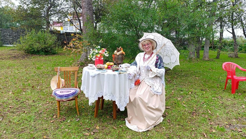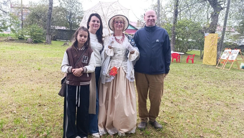За столом с белоснежной скатертью «приём» вела специалист по кадрам центральной библиотеки Людмила Петряева в стилизованном костюме, который сшила своими руками. Угощала чаем и вела светские беседы. А также фотографировалась с читателями. Попозировала и на фотографии с нашим мэром и её дочкой.