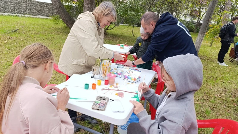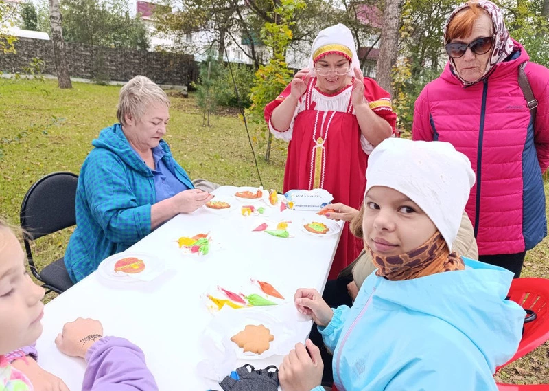 По другую сторону большой библиотечной поляны разместились мастер-классы, где дети и взрослые мастерили, рисовали, раскрашивали. Создавали иллюстрации к выбранным стихотворениям. А ещё были осенний декор пряников, аквагрим, значки и магнитики с пейзажными фотографиями. Самый маленький читатель, которому исполнилось 2 года и 7 месяцев, тоже что-то старательно раскрашивал акварельными красками.
