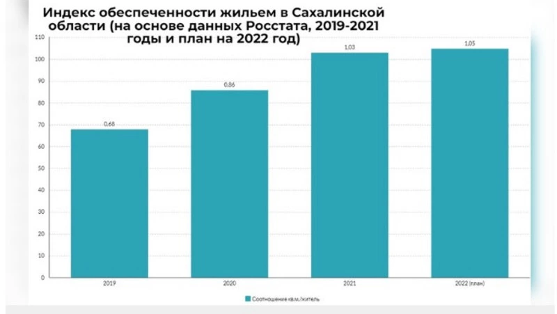 Уже в 2020 году Сахалинская область добилась показателя, который президент Владимир Путин ставил регионам России только к 2030-му: в островном регионе на одного жителя приходилось 0,89 квадратных метра нового жилья. Эта цифра в 2,2 раза превысила общероссийский показатель и на 30% – сахалинский рекорд 2019 года. А по итогам 2021 года этот показатель составил уже 1,03 квадратных метра на человека, согласно данным Росстата.