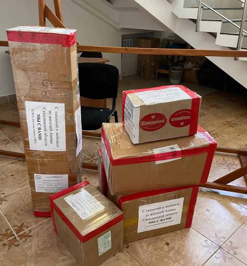 В сборе гуманитарного груза приняли участие активисты местной общественной организации инвалидов «Виктория», партийцы из первички «Единой России» первого микрорайона Анивы, сообщество анивчанок «Мы и наш город» и другие неравнодушные жители райцентра. Анивчанки из сообщества также помогли упаковать посылки. Транспорт для доставки упакованных коробок в региональный филиал фонда «Защитники Отечества» выделила администрация округа.